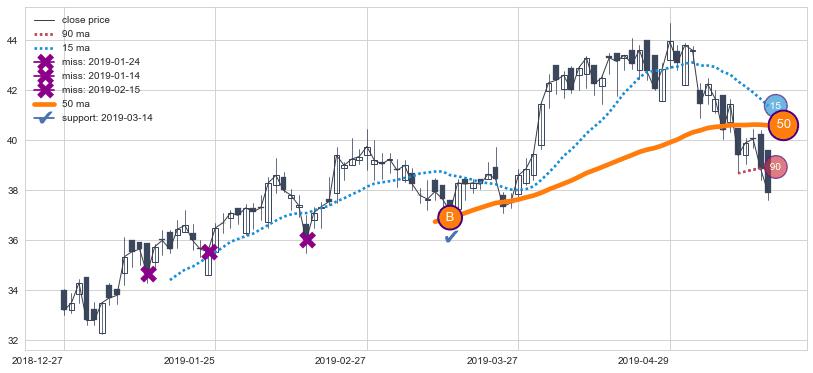 ⚄ 均线向上突破后价格围绕均线附近波动,并未远离均线,再次向下破位后维持原均线下跌趋势【极强】