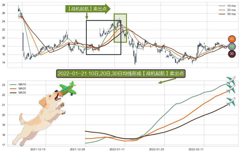 ⚀ 2021-12-28日-2022-02-21日显现 10日-20日-30日均线 【战机起航】卖出点 看空信号,后市看跌,卖出
