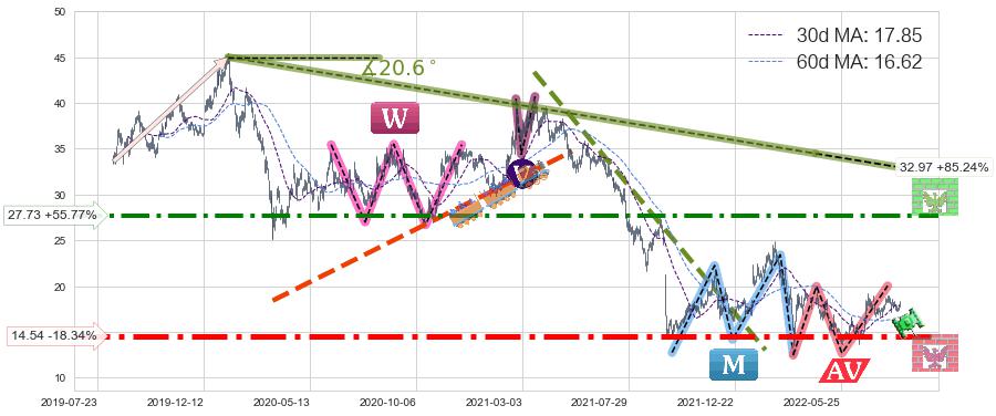 ♘ 阻力价格位27.73,可信任强度76.94%,距离最后交易2022-08-12形成的收盘价格17.80相差 +55.77%