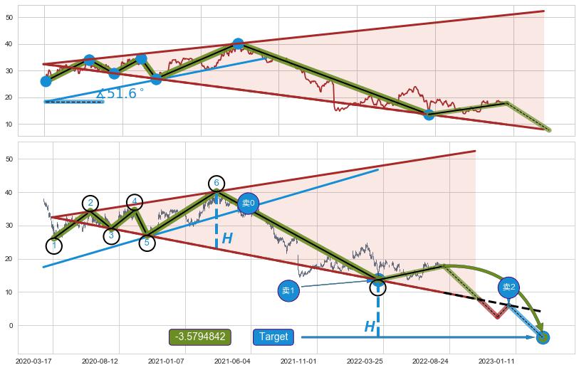 ➢ 最小反转跌幅→𝐇: 17.22 (逐步抬高阻力斜边最后的阻力点⑥与支撑边垂直距离)