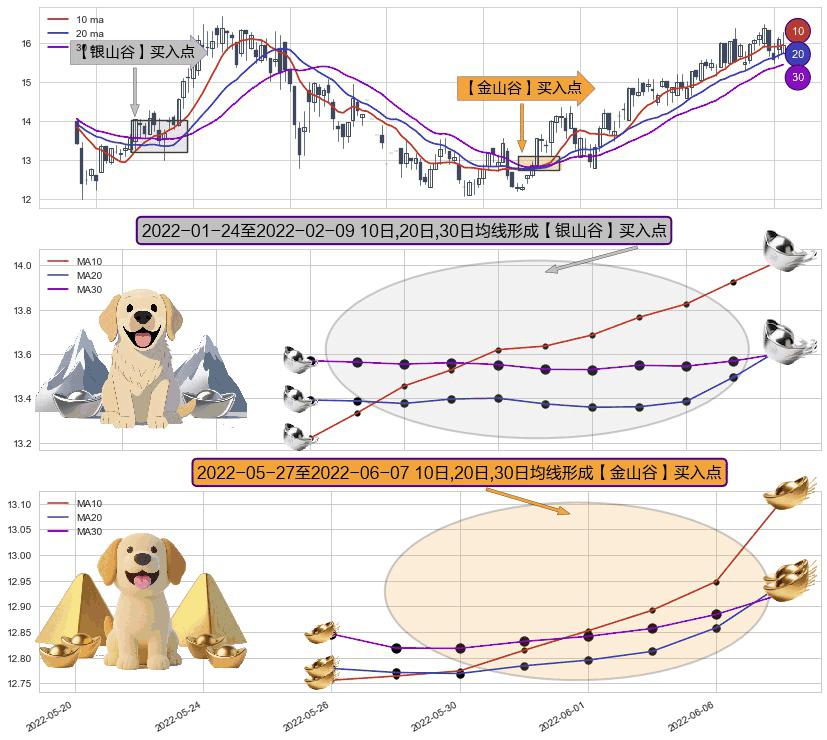 ⚂ 2022-05-30-日至2022-06-07-日显现 10日-20日-30日均线 【金山谷】买入点 其再次确认了买入信号,可靠性更强,买入