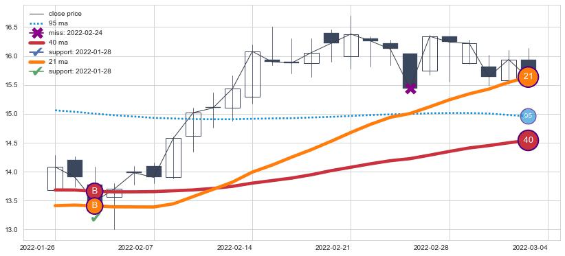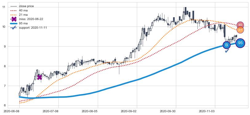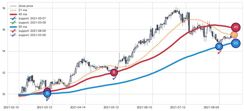 上涨趋势2021-02-10-2021-08-18,均线40, 95确认关键支撑3处
