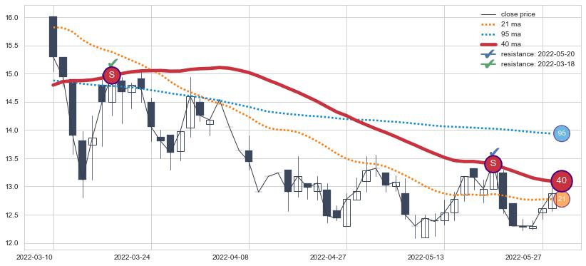 下跌趋势2022-03-10-2022-05-30,均线40确认关键阻力2处