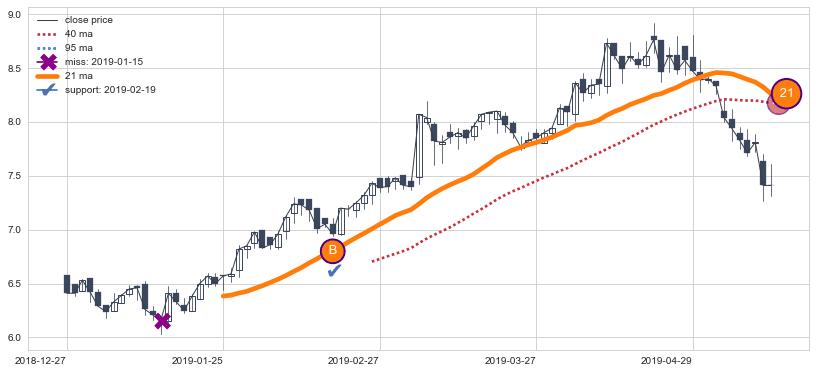 上涨趋势2018-12-27-2019-05-15,均线21确认关键支撑1处