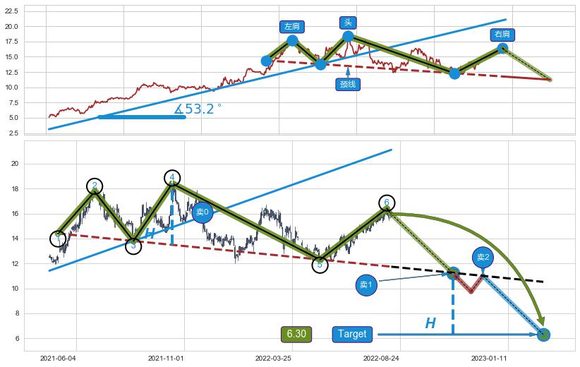 ➣ 最小反转跌幅→𝐇: 4.91 (头部与颈线垂直距离)