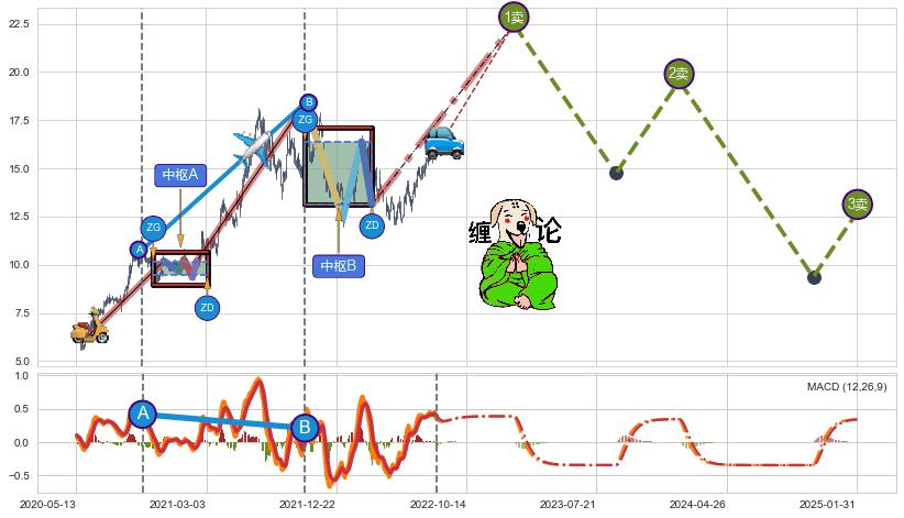 ➣ 【中枢B】:2021-10-15-2022-03-15,中枢由4笔构成,共104交易日, ZG=16.38, ZD=13.12