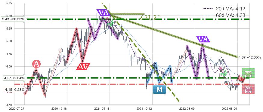 ♘ 阻力价格位4.27,可信任强度80.02%,距离最后交易2022-08-12形成的收盘价格4.16相差 +2.64%