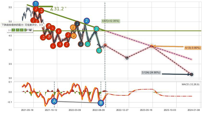 ♘ 在最后的下跌阶段2021-04-12至2022-08-11,存在 持续未破位的阻力位 ,阻力价格4.67,可信任强度79.25%,其距离最后价格4.16相差 +12.35%