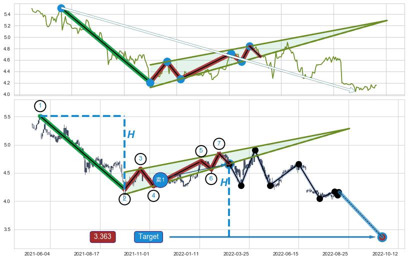 ➢ 【卖1】: 激进型 卖点→(2022-02-25: 4.66 )形成突破升🚩楔型【整理】形态