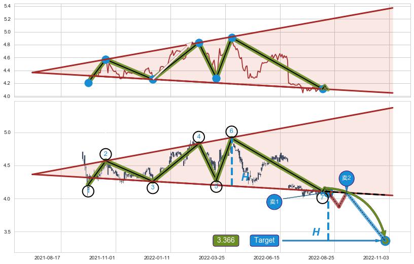 ➣ 【支撑】低点支撑位【③⑤⑦】一底低于一底,构成扩散三角的下斜边