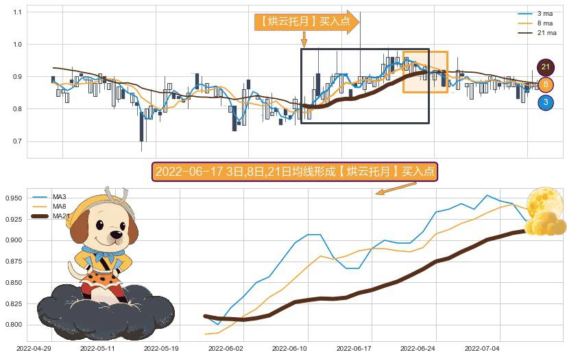 ⚀ 2022-05-26日-2022-07-08日显现 3日-8日-21日均线 【烘云托月】买入点 看多信号,后市看涨,买入