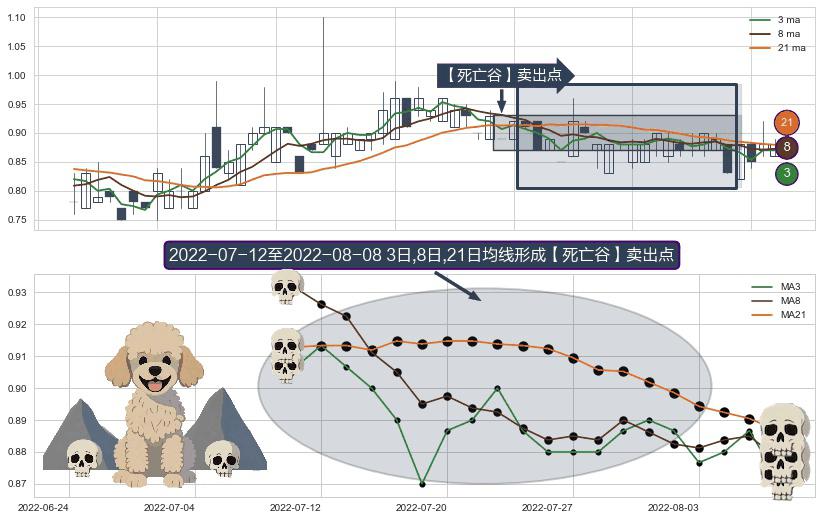 ⚀ 2022-07-13-日至2022-08-08-日显现 3日-8日-21日均线 【死亡谷】卖出点 看空信号,后市看跌,卖出