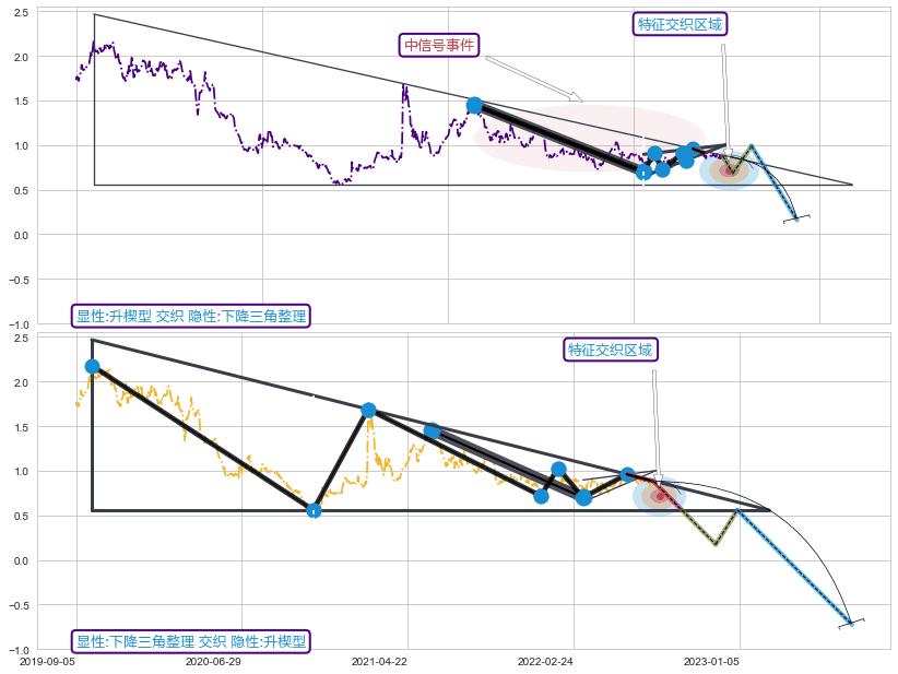 | 3 🅚:【死亡谷】卖出点 ➕ 📐:下降三角整理猜想突破点临近,临近关键支撑位,预期下沉突破下跌 ☞ 看空信号 ⇥ 【均线】交织【图形】⇥ 综合量化分数: 44 | > |