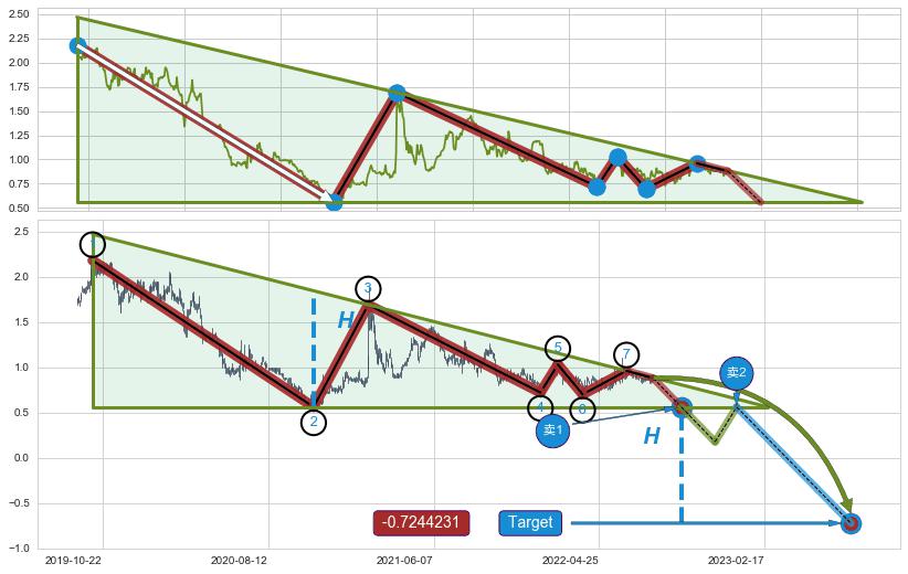 ➢ 最小中继整理跌幅→𝐇: 0.7500 (𝐇楔型旗杆的长度:楔型起点→顶点)
