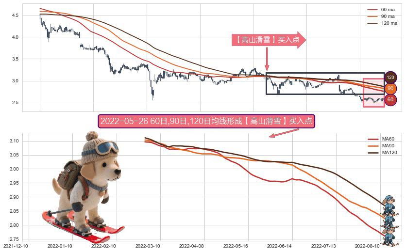 ⚀ 2022-03-01日-2022-08-12日显现 60日-90日-120日均线 【高山滑雪】买入点 看多信号,后市看涨,买入