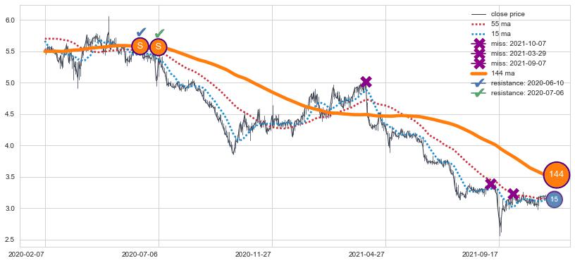 ⚅ 卖点向下突破均线后,价格走势有持续向下的迹象,但动能稍显不足,迟迟不能远离均线