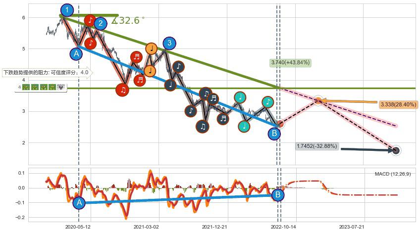 ♘ 在最后的下跌阶段2020-01-02至2022-08-12,存在 持续未破位的阻力位 ,阻力价格3.740,可信任强度85.43%,其距离最后价格2.600相差 +43.84%