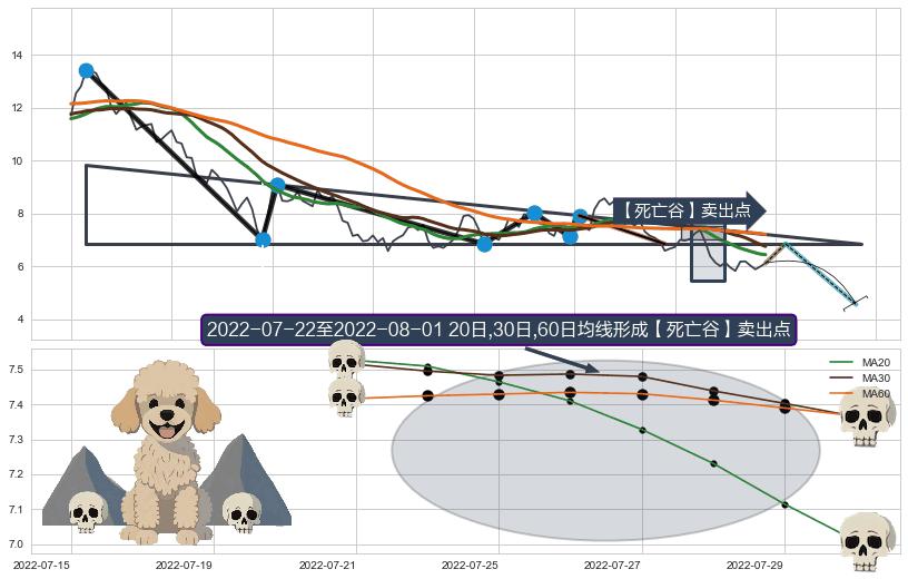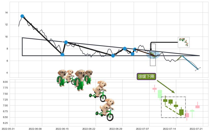 ➢ 【多方力量耗尽,空方打破攻守平衡点】下降三角形中继整理, 已在2022-07-15突破【支撑】颈线 6.85 →演变成下降通道