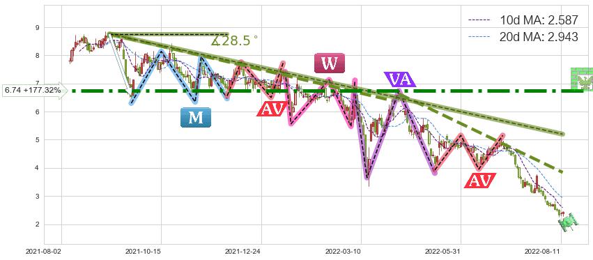 从2022-04-08至2022-08-12,共包含83个交易日,阶段股价下跌-91.59%,阶段股价变动位移路程比: 1 : 2,下跌趋势角度: 32.0