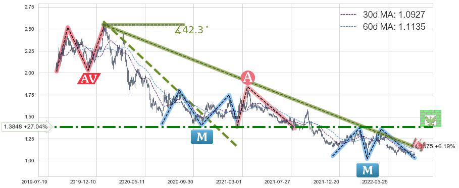 从2020-01-02至2022-08-12,共包含642个交易日,阶段股价下跌-73.45%,阶段股价变动位移路程比: 1 : 11,下跌趋势角度: 42.3