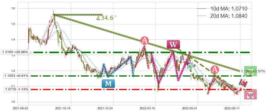 ➢ 【仅预测突破】最后价格:1.0900与预测突破价格:1.0700→【空间较大】后续最小【整理】第一目标价格→(2022-09-22: 0.9745 )