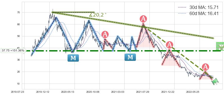 ♘ 阻力价格位37.75,可信任强度93.77%,距离最后交易2022-08-12形成的收盘价格15.02相差 +151.36%