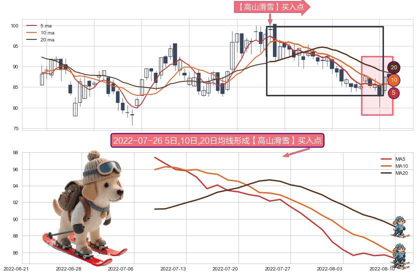 ⚀ 2022-07-08日-2022-08-10日显现 5日-10日-20日均线 【高山滑雪】买入点 看多信号,后市看涨,买入