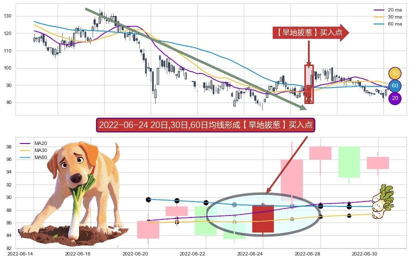 ⚀ 2022-06-24日显现 20日-30日-60日均线 【旱地拔葱】买入点 看多信号,后市看涨,买入