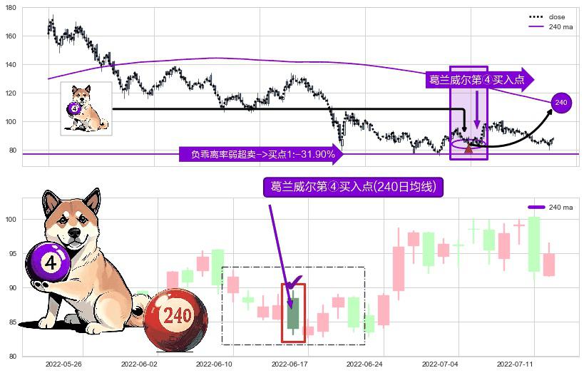 ⚀ 2022-06-16-日显现 葛兰威尔均线 240日均线 第④买入点 下降趋势均值回复的短线反弹信号,后市看涨,买进信号