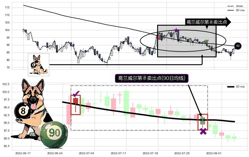 ⚀ 2022-07-27-日显现 葛兰威尔均线 90日均线 第⑧卖出点 下降趋势的中继信号,后市看跌,卖出信号