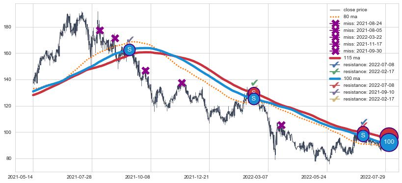 ⚄ 价格在均线遇到阻力后已再次向下回落了【较长】距离, 第⑦卖出点 阻力效果得到【初步确认】