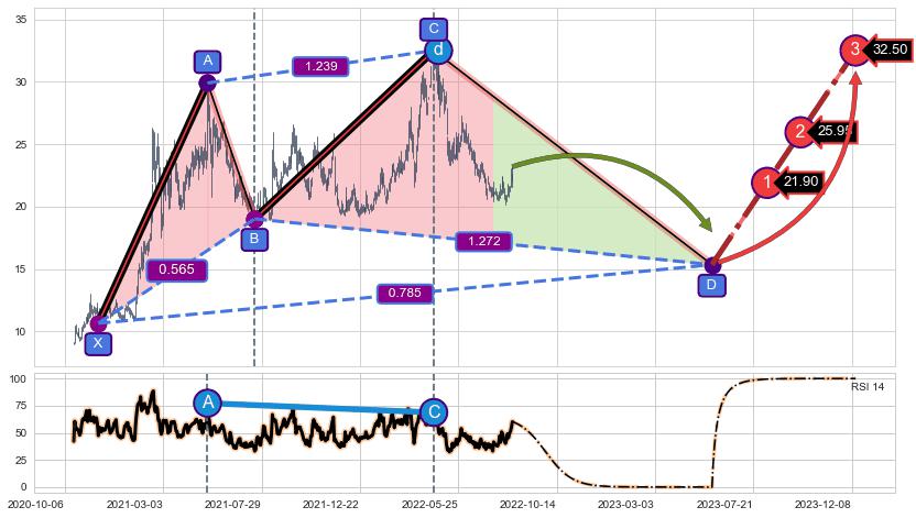 ➢ 谐波价格A点比C点低 ⤵,【RSI】指标A点比C点高 ⤴️