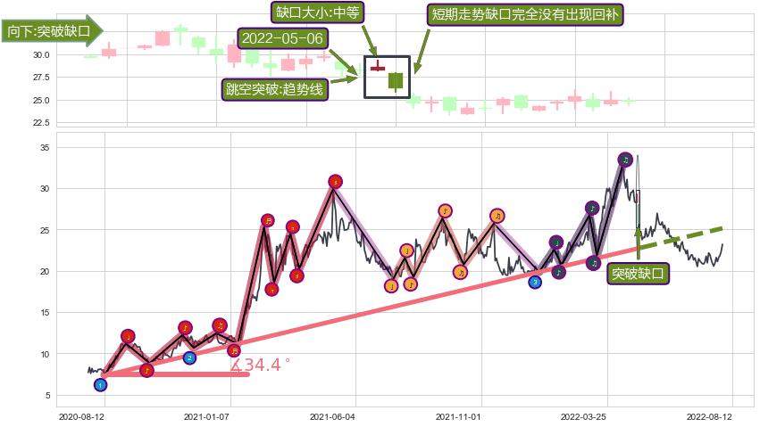 ➣ 2020-08-12-2022-05-11上升趋势存在反转[风险],虽然原上升趋势的支撑位(25.13)已破位,但其支撑效果尚存,原上升趋势角度: 34.4˚