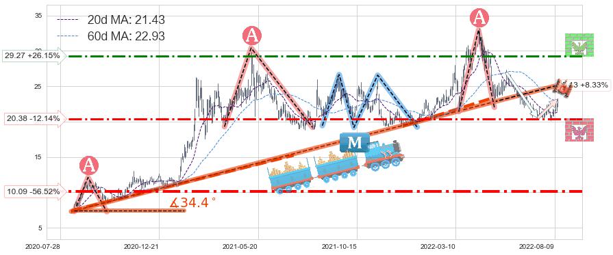 ♘ 支撑价格位20.38,可信任强度69.87%,距离最后交易2022-08-12形成的收盘价格23.20相差 -12.14%