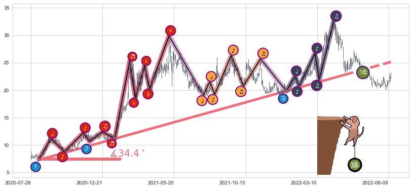 从2020-08-12至2022-05-11,共包含428个交易日,阶段股价上涨160.23%,阶段股价变动位移路程比: 1 : 8,上涨趋势角度: 34.4