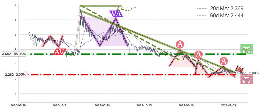 ♘ 阻力价格位3.682,可信任强度90.69%,距离最后交易2022-08-12形成的收盘价格2.330相差 +58.03%