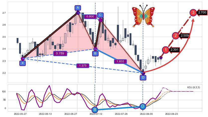 ➣ 已完成【蝴蝶】形态起点X: 2022-05-25, 终点D: 2022-08-03, 共49交易日