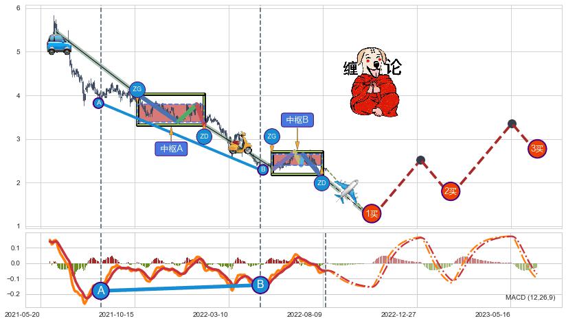 ➢ 【中枢B】:2022-05-25-2022-08-03,中枢由5笔构成,共49交易日, ZG=2.640, ZD=2.400