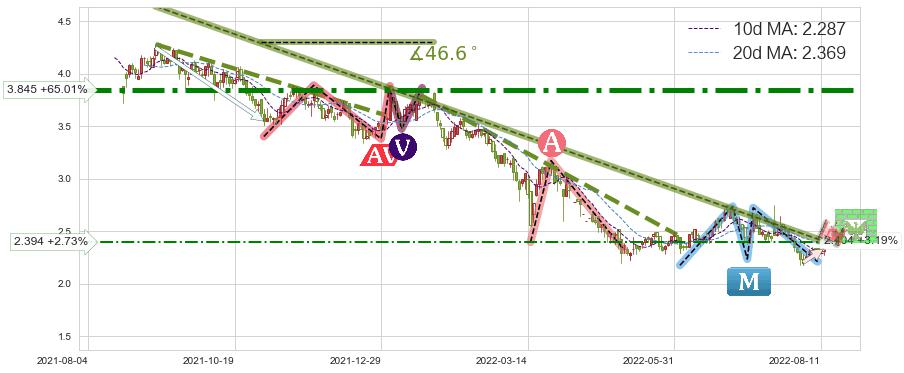 ♘ 阻力价格位3.845,可信任强度93.94%,距离最后交易2022-08-12形成的收盘价格2.330相差 +65.01%