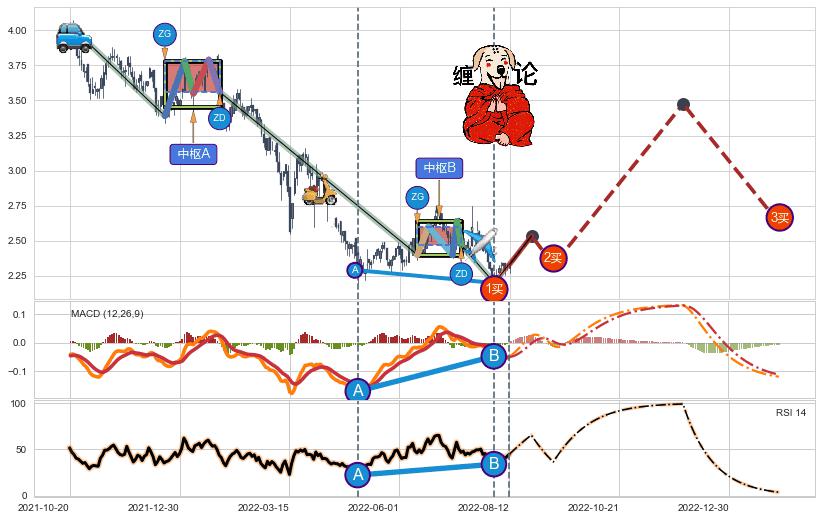 ➣ 【中枢B】:2022-06-14-2022-07-13,中枢由5笔构成,共21交易日, ZG=2.600, ZD=2.470