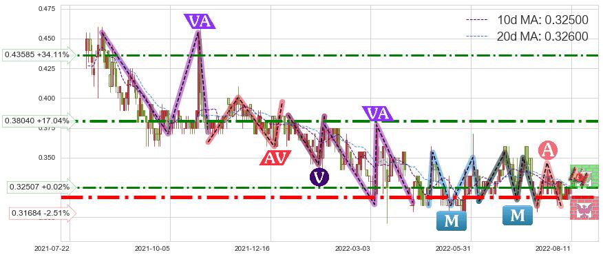 ♘ 阻力价格位0.43585,可信任强度60.04%,距离最后交易2022-08-12形成的收盘价格0.32500相差 +34.11%
