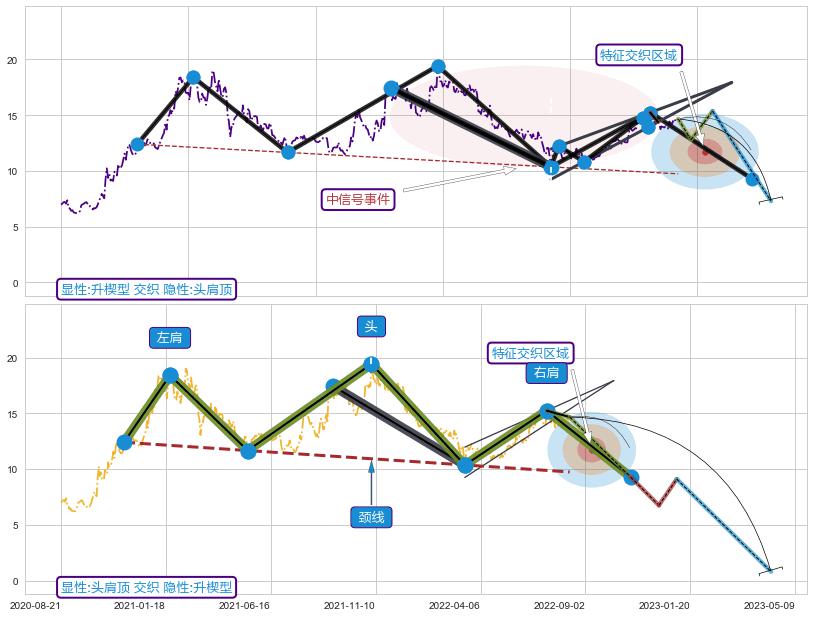 | 5 🅚:阴包阳(穿头破脚) ➕ 📐:头肩顶猜想突破点临近,临近关键支撑位,预期下沉突破下跌 ☞ 看空信号 ⇥ 【🅚线】交织【图形】⇥ 综合量化分数: 49 | > |