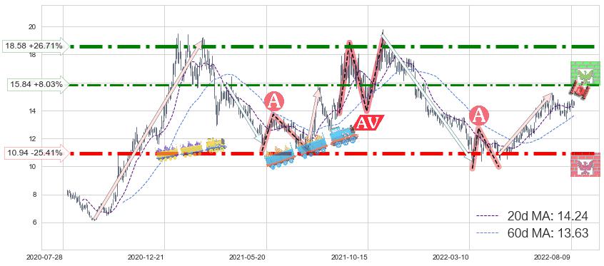 ♘ 阻力价格位15.84,可信任强度57.66%,距离最后交易2022-08-12形成的收盘价格14.66相差 +8.03%