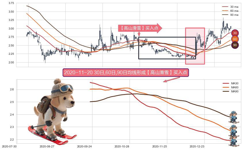 形态多维评估: ⚀ 2020-09-23日-2021-01-18日显现 30日-60日-90日均线 【高山滑雪】买入点 看多信号,后市看涨,买入