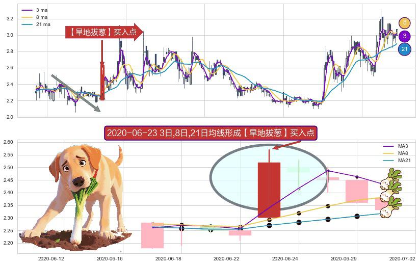 形态多维评估: ⚀ 2020-06-23日显现 3日-8日-21日均线 【旱地拔葱】买入点 看多信号,后市看涨,买入