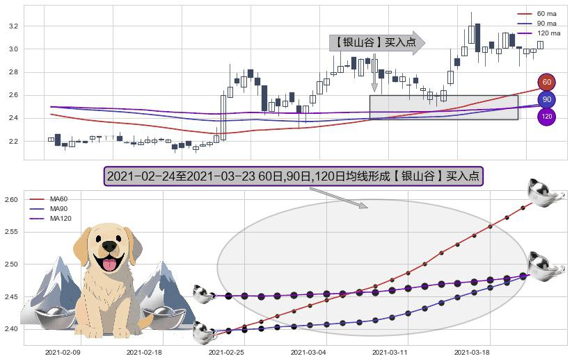 形态多维评估: ⚀ 2021-02-25-日至2021-03-23-日显现 60日-90日-120日均线 【银山谷】买入点 看多信号,后市看涨,买入