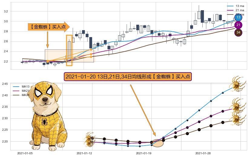 形态多维评估: ⚀ 2021-01-20日显现 13日-21日-34日均线 【金蜘蛛】买入点 看多信号,后市看涨,买入