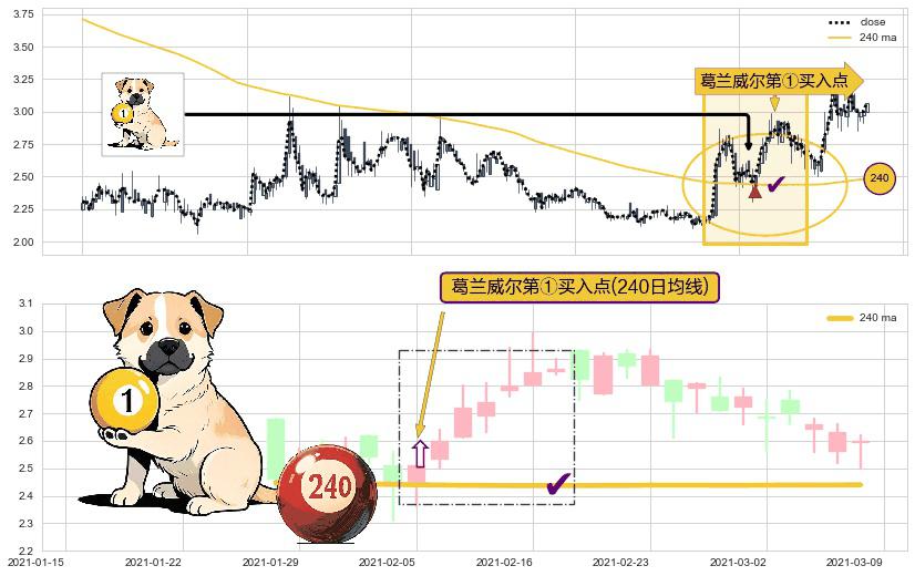 形态多维评估: ⚀ 2021-02-05-日显现 葛兰威尔均线 240日均线 第买①入点 走势反转见底信号,后市看涨,买进信号