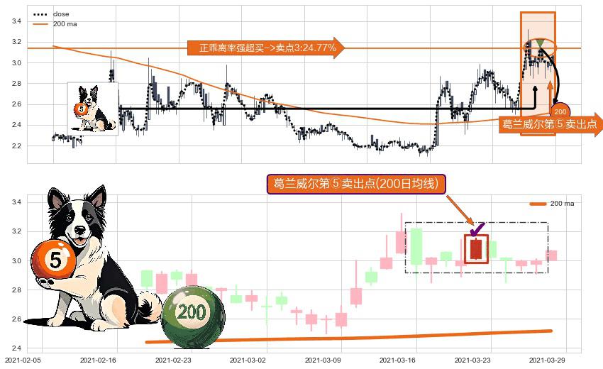 形态多维评估: ⚀ 2021-03-22-日显现 葛兰威尔均线 200日均线 第⑤卖出点 上升趋势均值回复的短线回落信号,后市看跌,卖出信号