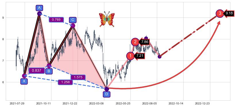 ➣ 已完成【蝴蝶】形态起点X: 2021-07-28, 终点D: 2022-03-15, 共157交易日